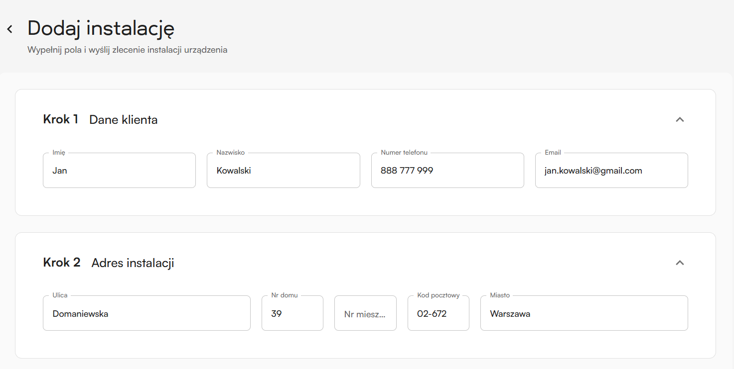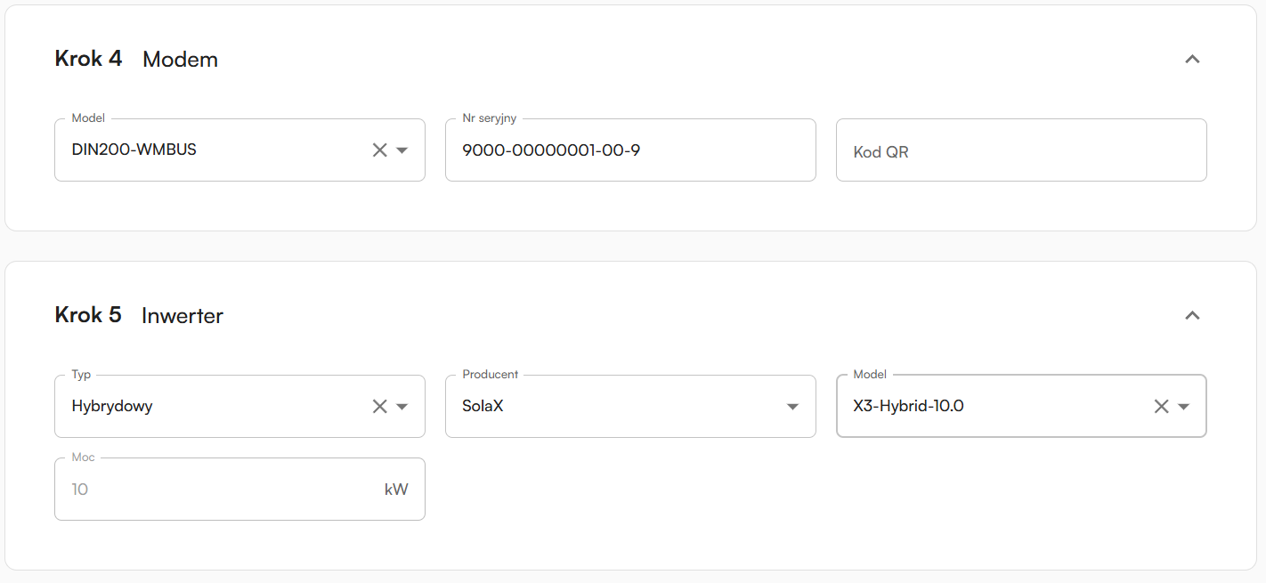 Nie. Nie musisz wypełniać wszystkich danych dotyczących instalacji. Po utworzeniu instalacji możesz ją edytować. Dodatkowo instalator przypisany do takiej instalacji może samodzielnie wybrać urządzenia (modem, inwerter, panele fotowoltaiczne, licznik energii, podlicznik energii oraz magazyn energii) podczas montażu w aplikacji mobilnej.