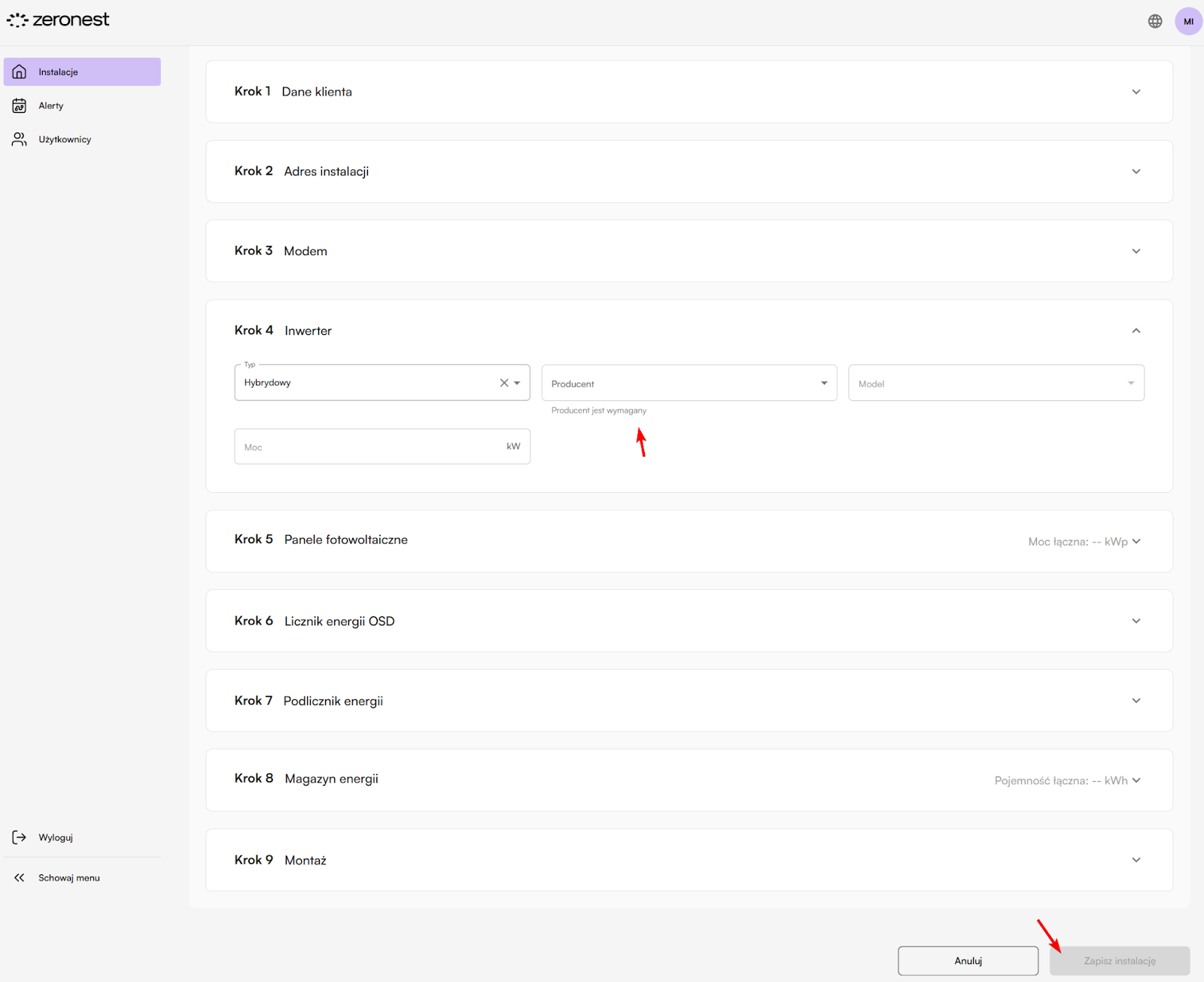 Adres e-mail musi zostać wcześniej dodany do platformy Zeronest jako „Instalator”.