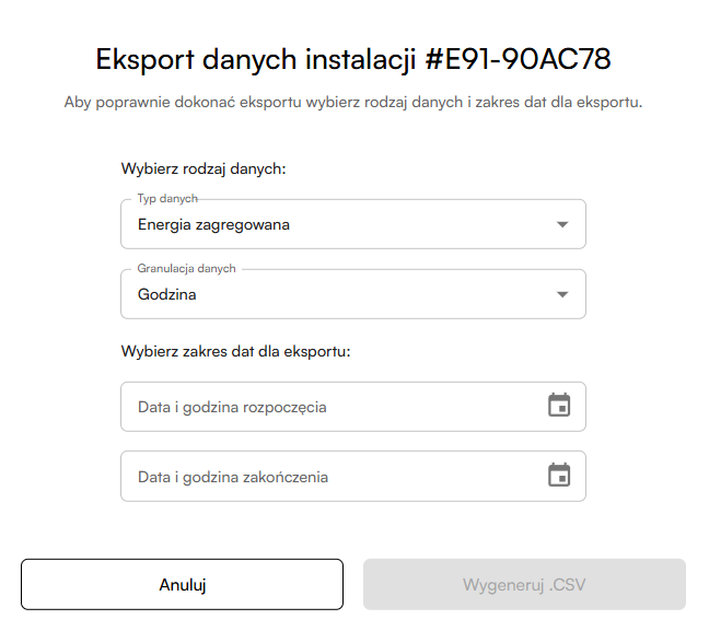 Możesz wybrać rodzaj eksportowanych danych: - Energia zagregowana - Dane z urządzeń Dla energii zagregowanej są dwie opcje granulacji danych: - 15 minut - 1 godzina Dodatkowo możesz wybrać okres czasu, z którego dane zostaną wyeksportowane.