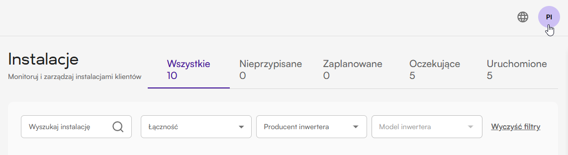 Gdzie znajdę listę wszystkich przypisanych instalacji do mojego konta? Listę znajdziesz po kliknięciu w menu opcji „Instalacje”. Panel pokaże wszystkie instalacje przypisane do Twojego konta. Na tym ekranie możesz filtrować instalacje po statusie, nazwie, łączności modemu oraz inwerterze.
